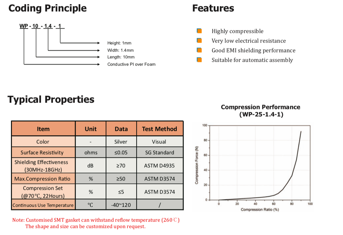 TMWP系列導電PI覆蓋泡棉材料由高導電Cu/Ni鍍層PI以及PU泡棉芯和導電壓敏丙烯酸粘合劑組成。這些材料具有極高的可壓縮性,專門設計用于提供卓越的EMI屏蔽和接地性能,并提供防塵和防潮保護。WP系列產品因其容易調整尺寸,適用于計算機、智能手機、LCD/TV和電信制造行業的固定墊圈應用,可根據要求定制回流焊墊片。" />